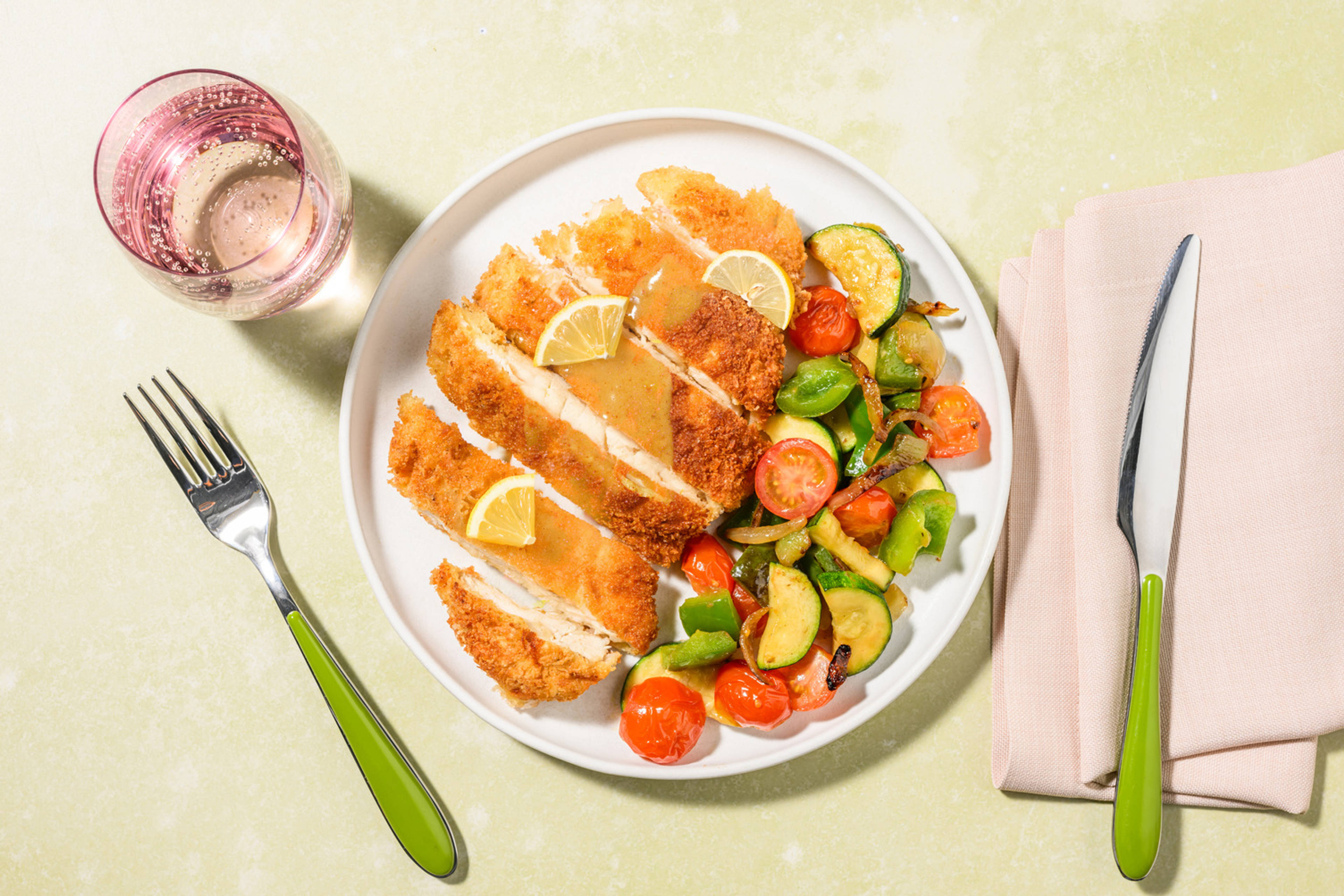 ¡Asegúrate de utilizar las cantidades indicadas a la izquierda para preparar tu receta! Retira los extremos del calabacín y córtalo por la mitad a lo largo. Luego, corta cada mitad en medias lunas de 0,5-1 cm. Retira el tallo de la berenjena y córtala en dados de 1-2 cm. Corta el tomate por la mitad, luego, corta cada mitad en cuartos.